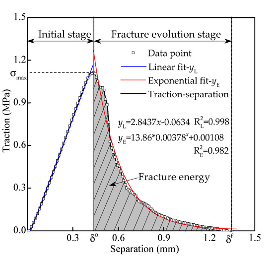 where G is fracture energy in J/mm2; δo and δf are separation distance at initial fracture point and complete failure point; and yE is exponential fit equation in the fracture evolution stage.