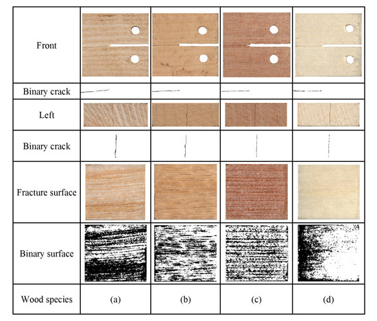 Figure 7 shows the typical CT failure modes of all wood species evaluated in this study in front and left views, as well as fracture surfaces. Meanwhile, the corresponding cracks photos were extracted and transferred to binary images for calculating fractal dimensions of them according to the method described in Section 2.4.