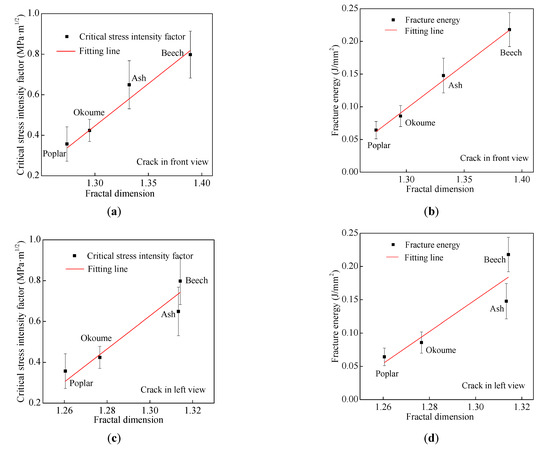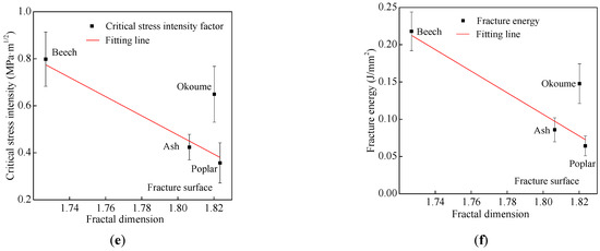 The effect of wood species on fracture characteristic values, maximum fracture load, critical stress intensity factor, and energy were studied considering ash, beech, okoume, and poplar with 12 replications for each. Afterwards, failure modes of all tested CT samples were scanned using a Canon scanner (9000F MarkII, Canon, Tokyo, Japan) to obtain photos of cracks in front and left views of samples, as well as photos of fracture surfaces. Finally, fractal dimensions of these photos were calculated and relationships between these fractal dimensions and fracture characteristic values were regressed.