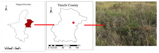 The study site is located at the Yanchi Research Station of Beijing Forest University (37°42′31″ N, 107°13′47″ E, 1530 m above mean sea level), Ningxia, northwest China (Figure 1). The site is representative of a transitional zone between arid and semiarid conditions at the southern edge of the Mu Us Desert. The prevailing regional climate is temperate arid and semiarid, characterized with scarce rainfall, irregularly distributed, and variable from year to year. The mean annual temperature (based on 1954–2020 data) is 8.4 °C, and the mean annual precipitation is 293 mm. Most precipitation (>70%) occurs during June–September (data source: Yanchi Meteorological Station, Yanchi Research Station).
