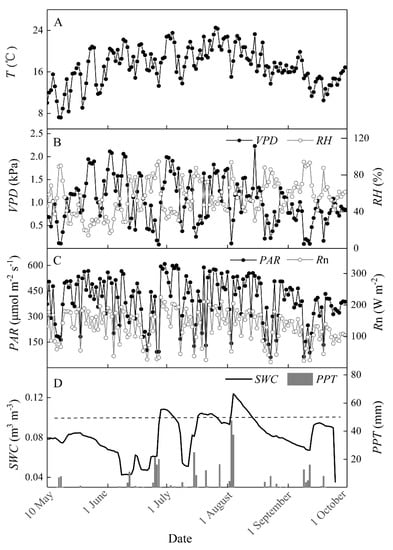 Temporal variation in daily mean air temperature (T, (A)), relative humidity (RH) and water vapor pressure deficit (VPD, (B)), net radiation (Rn) and incident photosynthetically active radiation (PAR, (C)), and soil water content (SWC) and daily total precipitation (PPT, (D)) during a five-month field campaign from 1 May−30 September 2019. The horizontal dashed line in subfigure D represents the 0.10 m3 m−3 threshold assigned for SWC.