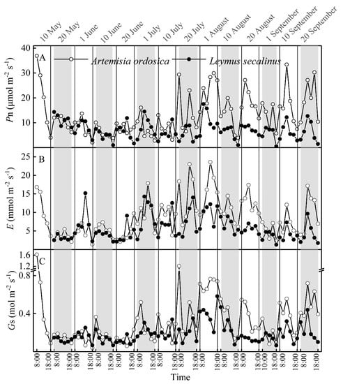 The measurements were taken from plants enclosed within three 5 × 5 m2 plots. Three individuals of both A. ordosica and L. secalinus were randomly selected in each plot (n = 9) assigned for in situ measurements [,,]. Photosynthesis was measured on fully developed leaves on the south-facing side of each assigned plant individuals, every 10 days from May to September 2019. The measurements were taken with a portable LI-6400 photosynthesis system, equipped with 2×3 cm2 transparent light source chamber (Li-Cor Inc., Lincoln, NE, USA). Five measurements were taken from each individual plant, during each measurement period. All leaf gas-exchange characteristics were measured six times every ~2-h from 8:00–18:00 Local Beijing Time (Greenwich Mean Time + 8 h). Rates of photosynthesis and transpiration (Pn and E, in μmol m−2 s−1 and mmol m−2 s−1, respectively) and stomatal conductance (Gs, mol m−2 s−1) were measured, which were expressed per unit leaf area. The leaf area of fresh leaves was measured at the same time using an LI-3100C leaf area meter (LI-COR Environmental, Lincoln, NE, USA).