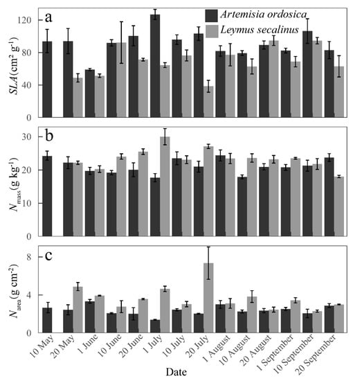 Leaf characteristics, including specific leaf area (SLA, (a)), leaf N concentration by dry weigh (Nmass, (b)), and N concentration per unit leaf area (Narea, (c)) for A. ordosica and L. secalinus during the five-month field campaign from 1 May−30 September 2019.