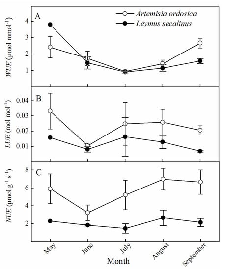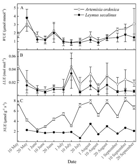 Seasonal changes in water (A), light (B), and nitrogen use efficiencies (C) (i.e., WUE, LUE, and NUE) in A. ordosica and L. secalinus. Bars indicate standard error of estimate.