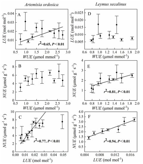 Relationships between resource use efficiencies (i.e., WUE, LUE, and NUE) during the growing season. Relationships between LUE and WUE (A), WUE and NUE (B), LUE and NUE (C) for A. ordosica and relationships between LUE and WUE (D), WUE and NUE (E), LUE and NUE (F) for L. secalinus. Data points are binned averages, with WUE and LUE specified in increments of 0.2 μmol mmol−1 and 0.002 mol mol−1, respectively. Bars indicate standard error of estimate.