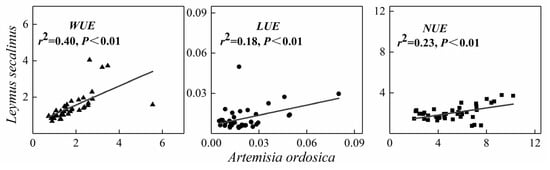 Positive correlations were detected between LUE and NUE for both A. ordosica (r2 = 0.77, p < 0.01; Figure 7C) and L. secalinus (r2 = 0.94, p < 0.01; Figure 7F). There were positive correlations between WUE and LUE (r2 = 0.65, p < 0.01; Figure 7A) for A. ordosica and WUE and NUE for L. secalinus (r2 = 0.81, p < 0.01; Figure 7E), but no such correlation existed when comparing the opposite use efficiency pairings (Figure 7B,D). RUEs for A. ordosica were positively correlated with those for L. secalinus (WUE, r2 = 0.40, p < 0.01; LUE, r2 = 0.18, p < 0.01; and NUE, r2 = 0.23; p < 0.01; Figure 8). Overall, there were statistically significant differences in WUE, LUE, and NUE between the two species (p < 0.01, based on student t-tests; Figure 9).