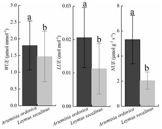 Pairwise comparisons of WUE, LUE, and NUE for A. ordosica and L. secalinus. Different letters (a and b) indicate statistically significant differences by paired, student t-tests based on a critical probability of 0.01.