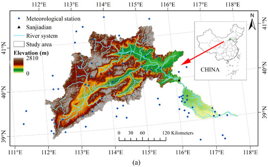 The Yongding River watershed (Figure 1a), crossing five provinces (Inner Mongolia, Shanxi, Hebei, Beijing, and Tianjin), is located southwest of Beijing (112°–117°45′ E and 38°27′–41°20′ N). The total area of this watershed is 47,016 km2, with high elevations in the northwest and low elevations in the southeast, including mountain areas (45,063 km2) and plain areas (1953 km2), with Sanjiadian as the boundary. The average groundwater depth in the plain area is 4–50 m, most of which is more than 20 m (data were developed by the website of Ministry of Water Resources of the People’s Republic of China http://www.mwr.gov.cn/ accessed on 29 January 2019). The area has a temperate continental monsoon climate, with mean annual precipitation from 360 mm to 650 mm, a mean annual temperature of 6.9 °C, and a mean annual runoff of 12.13 mm (averaged from 1963 to 2018). The vegetation growing season in this region is from April to September since the precipitation is concentrated and the temperature is optimum during this period. Major vegetation types include needleleaf forest, broadleaf forest, scrub, steppe, and cultural vegetation, where cultural vegetation refers to the phytocommunity formed by artificial cultivation, including irrigated or nonirrigated crops and deciduous orchards (Figure 1b). The main soil texture types are clay loam and sandy loam (Figure 1c).