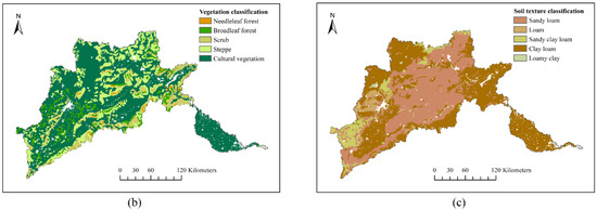 The above remote-sensing data products are collection 6, which was obtained from NASA EARTHDATA (https://earthdata.nasa.gov/ accessed on 1 April 2020) and includes MOD13A3, MCD15A2H, and MOD16A2. These products were defined to the WGS84 geographic coordinate system and Albers projection coordinate system and resampled to 1 km by the MODIS Reprojection Tool (MRT). Briefly, simulated was calculated in each grid cell with an area of 1 km × 1 km, and a variety of parameters were set in light of the actual vegetation and soil texture types (Figure 1b,c). It was assumed that there was no energy or water exchange between grids. After removing urban and built-up lands, water bodies, wetlands, and barren areas, a total of 47,690 grids were calculated.