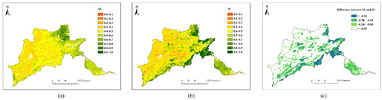 The simulated under the natural environment that a specific climate and soil can maintain was calculated based upon the meteorological, soil, and vegetation data of the watershed for 19 years, with an average of 0.475 (Figure 3a, 2000–2018). The average values of needleleaf forest, broadleaf forest, scrub, steppe, and cultural vegetation in the growing season were 0.433 ± 0.066, 0.395 ± 0.089, 0.498 ± 0.090, 0.548 ± 0.116, and 0.458 ± 0.100, respectively, from 2000 to 2018. The simulated values were highest in the north and east of the study area and lowest in the central and southwest regions, where the simulated values were roughly similar to the observed values. exhibited a wide range, from 0.058 to 1, while exhibited a range from 0.212 to 0.949. The differences between the and values increase from the northwest to the southeast of this area, with a maximum value exceeding 0.3 (Figure 3c).