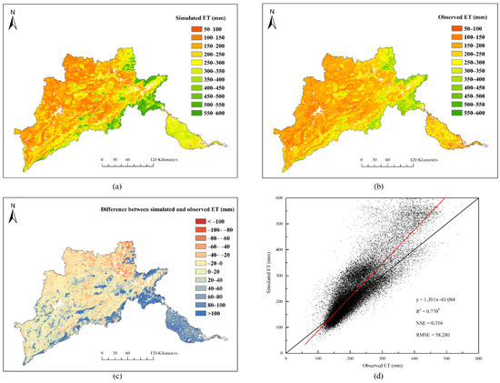 Interestingly, the slope and intercept of the linear function are 1.300 ± 0.003 and −43.084 ± 0.729, respectively. The simulated ET is slightly higher than the observed ET. With successive increases in the observed ET, the degree of deviation of the simulated ET increases. The root mean square error (RMSE) of the scatter plot is 58.280, which indicates that there are marked differences between the simulated ET and the observed ET in some areas. The spatial distribution of these differences is provided in Figure 4c. Compared with the vegetation type distribution (Figure 1b), it can be seen that vegetation types with large differences between the simulated ET and the observed ET are forest (including needleleaf forest and broadleaf forest) and scrub, with high vegetation coverage.