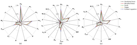 The following are available online at https://www.mdpi.com/article/10.3390/f12101377/s1, Table S1: Correlation coefficients between the meteorological variables for needleleaf forest, Table S2: Correlation coefficients between the meteorological variables for broadleaf forest, Table S3: Correlation coefficients between the meteorological variables for scrub, Table S4: Correlation coefficients between the meteorological variables for steppe, and Table S5: Correlation coefficients between the meteorological variables for cultural vegetation.