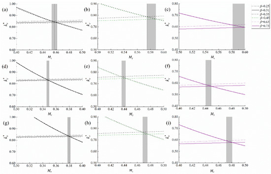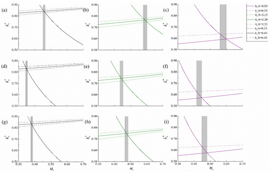 Changes in with variations in the stem fraction ( ). In this study, the observed of broadleaf forest ranged from 0.35 to 0.45 with the original value of 0.40 in the model; the observed of scrub ranged from 0.15 to 0.25 with the original value of 0.20, and the observed of steppe ranged from 0.00 to 0.10 with the original value of 0.00. The intersection of the auxiliary vertical line and abscissa is . Vegetation types and soil texture types: (a,d,g) Broadleaf forest; (b,e,h) scrub; (c,f,i) steppe; (a–c) sandy loam; (d–f) loam; (g–i) loamy clay, clay loam, or sandy clay loam.