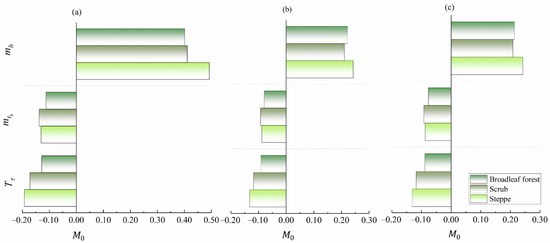 To shed more light on the response of to changes in meteorological factors, it is necessary to determine the threshold values of these factors over the years. Obviously, the , , and values have a great influence on the value (Figure 5). increases as increases and and decrease (Figure 8). When the parameter changes in the same range, the variation value of for sandy loam soil is almost twice that for other soil types. Meanwhile, the of steppe changes more than that of scrub and broadleaf forest. When the parameter changes in the same range, the fluctuation of for scrub is slightly larger than that for steppe and broadleaf forest. The response ranges of dissimilar vegetation types to temperature sorted by size are steppe, scrub, and broadleaf forest. In summary, the response of to meteorological factors fluctuates most intensively if the soil type is sandy loam. and strongly affected the of the steppe, and the change in had the greatest influence on the of scrub.