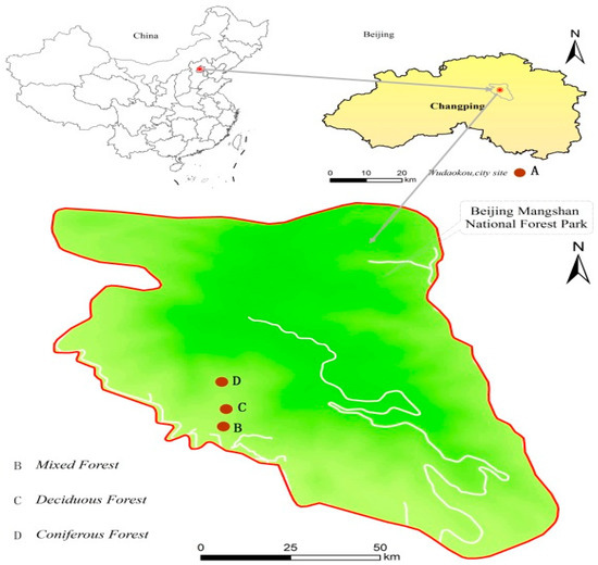All experimental sites in this study were in Beijing, China (Figure 1). Three types of forest sites were in Mangshan National Forest Park of Changping District, 40 km away from downtown area. The total area of Mangshan National Forest Park is 8622 ha, and it is the largest national forest park in Beijing. The forest coverage rate is 86%.