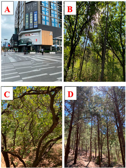 Photos: (A) city site, (B) mixed forest, (C) deciduous forest, (D) coniferous forest.