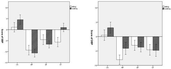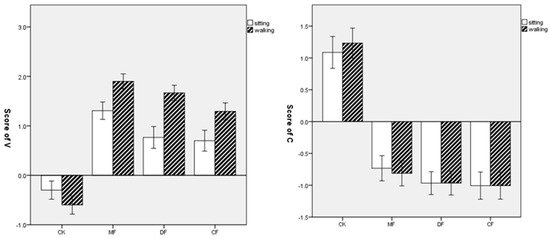 In the case of the POMS, the mean values and standard deviation (SD) scores are illustrated in Table 7. The five subscales that measured negative mood state all had a lower value, while the vigor subscale indicated that positive mood state had a higher value in all three forests. The level of T–A, A–H, F and C scores had a similar decreasing trend after the sitting activity, with the highest decrease in the coniferous forest followed by the deciduous forest and mixed forest. The walking activity in the coniferous forest was correlated with the lowest level of T–A, A–H and C values, while walking in the deciduous forest was related to the lowest level of F and D values. The level of the V score indicated a similar increasing trend after both sitting and walking activities, with the highest increase in the mixed forest and the lowest increase in the coniferous forest. On the contrary, all the values of the T–A, A–H, F, D and C scores increased, while the value of V decreased in the urban site for both the sitting and walking activities (Figure 5).