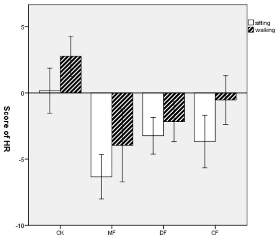 Comparison of changes in SBP and DBP as well as HR at the four environmental sites after sitting and walking activities. Data were presented as the means ± SEs. CK = city site, MF = mixed forest, DF = deciduous forest, CF = coniferous forest.