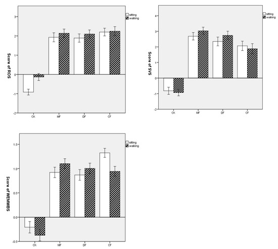 The mean values and standard deviation (SD) of the Restoration Outcome Scale (ROS) score are illustrated in Table 6. In all three kinds of forests, sitting and walking activities had positive effects on the ROS of the participants. The results showed that, compared to the city site (CK), the values of ROS increased in all three types of forest. For the sitting activity, the values of ROS presented the highest increase in the coniferous forest and the lowest increase in the deciduous forest. For the walking activity, there was a similar increasing as with the sitting activity, The value of ROS showed the highest increase in the coniferous forest followed by the mixed forest and deciduous forest. In short, the values of ROS achieved the best increase in the coniferous forest after the walking activity (Figure 4).