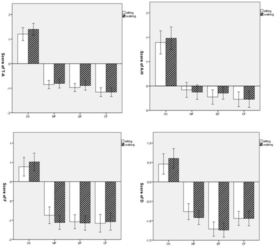 Comparison of changes in POMS subscales (tension–anxiety (T–A), anger–hostility (A–H), fatigue (F), depression (D), confusion (C) and vigor (V)) of the four environmental sites after sitting and walking activities. Data were presented as the means ± SEs. CK = city site, MF = mixed forest, DF = deciduous forest, CF = coniferous forest.