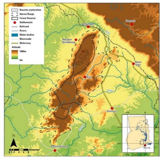- A Roacha Ghana. Location of Bauxite Exploration Area in the Atewa Range Forest Reserve, Ghana. 2020. Available online: https://bit.ly/3AaYFNf (accessed on 6 May 2021).