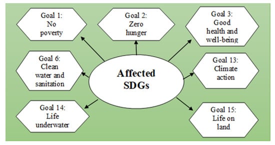 It is assumed from the findings that mining in the forest reserve will have a huge impact on both environmentally centered and human-centered SDGs. It is evident from the results that seven goals will be directly affected if the proposed mining project takes place: Goal 1: No poverty; Goal 2: Zero hunger; Goal 3: Good health and wellbeing; Goal 6: Clean water and sanitation; Goal 13: Climate action; Goal 14: Life underwater; and Goal 15: Life on land (see Figure 5). Deforestation due to human activity and climate change presents significant threats to sustainable development, impacting the lives and livelihoods of millions of people. Forests play a crucial role in the fight against climate change in order to preserve life on the planet. The ecosystems of various species depend on the health and existence of the forest reserve. Destroying the forest and its water bodies means the destruction of the very foundations of the economy, livelihoods, food security, health, and quality of life across the district, region, and nationwide [].