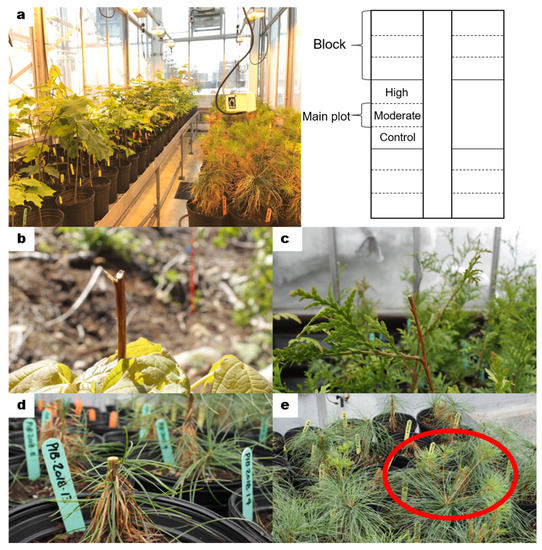 Greenhouse experimental design and illustrations of the simulated browsing treatments. (a) Picture of the greenhouse before distribution of seedlings in blocks and schematic illustration of the experimental design. Water reduction treatment was applied on the main plots (control, moderate reduction, high reduction), while the simulated browsing treatment, geographic provenance and species were distributed randomly within the main plots; (b) Browsing by white-tailed deer (Odocoileus virginianus) on sugar maple (Acer saccharum) at the plantation site (Réserve faunique de Portneuf, QC, Canada); (c) Simulated browsing on the apical shoot of white cedar (Thuja occidentalis); (d) Simulated browsing on white pine (Pinus strobus); (e) Example of a white pine (red ellipse) that experienced a second bud burst in the fall preceding the simulation experiment.