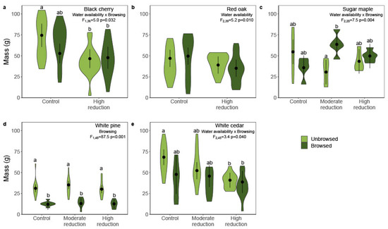Differential effect of simulated winter browsing and reduced water availability on total mass of five seedling’s species from a greenhouse experiment. Dry mass ( ± 95%CI of model estimates) of (a) black cherry (Prunus serotina Ehrh.); (b) northern red oak (Quercus rubra L.); (c) sugar maple (Acer saccharum Marsh.); (d) white pine (Pinus strobus L.); (e) white cedar (Thuja occidentalis L.). We measured the dry mass after ten weeks of growth under two or three levels of water availability reduction (control: 80% of pot capacity; moderate reduction: 50%; high reduction: 25%). We used a linear mixed model with a random effect of blocks (n = 5) to evaluate the effect of treatments on mass. To account for differences between the initial mass of seedlings, height at the beginning of the experiment and its interactions were included as a covariate in the model. Different letters indicate a posteriori least square mean differences performed on either simulated browsing or water stress treatment or both (α = 0.05). Violin shapes represent the distribution of the data.