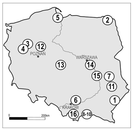 The location of the study area. 1. Bolestraszyce, 2. Bród Nowy, 3. Bucharzewo, 4. Chorzępowo, 5. Gdańsk-Oliwa, 6. Kraków, 7. Lublin, 8. Muszyna (Ogrody Biblijne), 9. Muszyna (Ogrody Magiczne), 10. Muszyna (Ogrody Sensoryczne), 11. Osmolice, 12. Owińska, 13. Poddębice, 14. Powsin, 15. Trzcianki, 16. Zawoja (Babiogorski National Park).