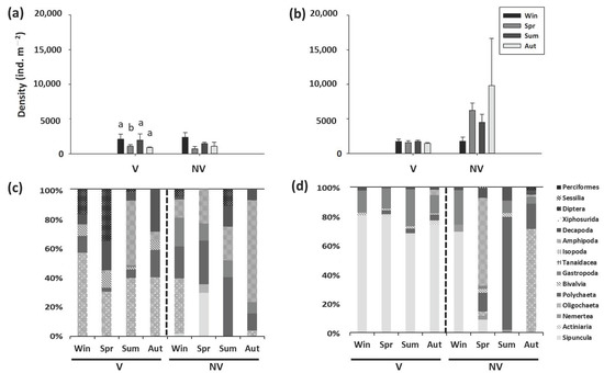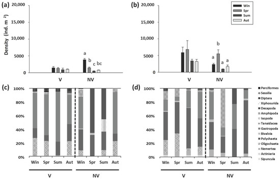 Seasonal variations in the density (mean ± SE) and macrobenthic community composition in the Avicennia marina mangroves in (a,c) BD and (b,d) BM. v, mangroves; nv, nonvegetated mudflats; win, winter; spr, spring; sum, summer; aut, autumn. Within each site, different letters above columns denote significant (p < 0.05) differences among seasons with the Tukey’s post-hoc test.