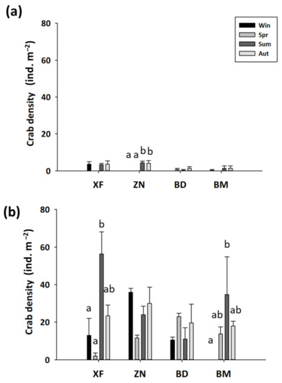 Crab density (mean ± SE) in the (a) mangroves and (b) nonvegetated mudflats of the four sites on the western coast of Taiwan in different seasons. win, winter; spr, spring; sum, summer; aut, autumn. Within each site, different letters above columns denote significant (p < 0.05) differences among seasons with the Tukey’s post-hoc test.
