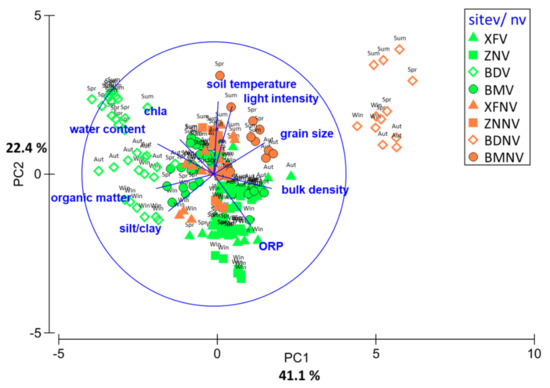 PCA of the sediment features in mangroves (V) and nonvegetated mudflats (NV) on the western coast of Taiwan in different seasons. Black: mangroves, gray: mudflats, ▲: XF, ■: ZN, ◇: BD, ●: BM. win, winter; spr, spring; sum, summer; aut, autumn.