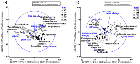 The results of the DistLM and dbRDA showed that the first two axes can explain 33.5% of the total variation in the macrobenthic communities in the K. obovata mangroves (Figure 5a). The macrobenthic communities collected in ZW were similar to those collected in WZ and FY. The first axis, which correlated most strongly with the silt/clay content (r = −0.898) and grain size (r = −0.243), explained 25.2% of the variation; the second axis, which correlated most strongly with tree density (r = 0.716) and water content (r = −0.596), explained 8.3% of the total variation. Superimposing the clustering results of forest structure, sediment features, and macrobenthic communities showed that the relatively higher tree density and lower silt/clay content in the frequently flooded site (XF) were correlated with juvenile crab, shellfish larva, Dolichopodidae larva, Corophiidae, and Oligochaeta abundance; the higher tree density and silt/clay content in the high-elevation site (ZN) were correlated with Phascolosoma arcuatum, Assimineidae, and Hyala bella abundance; and the lower tree density in ZW, WZ, and FY was correlated most strongly with Capitellidae, Orbiniidae, Talitridae, and Grapsidae abundance. In summary, tree density and sediment silt/clay content were the main factors structuring the macrobenthic community in the K. obovata mangroves.