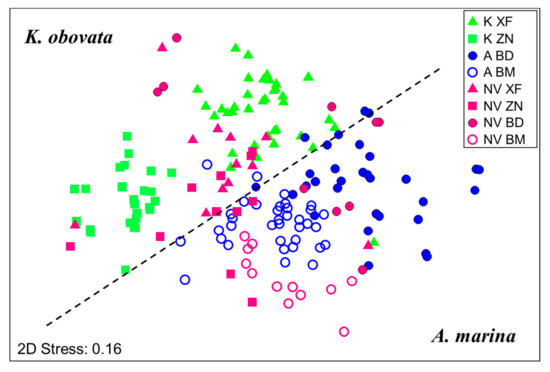 The MDS ordination of the macrobenthic communities collected from the four mangroves (K, K. obovata; A, A. marina) and nonvegetated mudflats (NV) of the four sites (XF, ZN, BD, and BM) on the western coast of Taiwan.