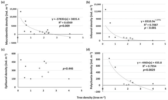 Relationships between the densities of (a) macrobenthos, (b) infauna, (c) epifauna, and (d) polychaetes and the tree density of Kandelia obovata. White dots: this study; black dots: prior studies.