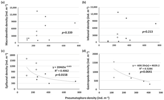 Relationships between the densities of (a) macrobenthos, (b) infauna, (c) epifauna, and (d) gastropods and Avicennia marina pneumatophore density. White dots: this study; black dots: prior studies.