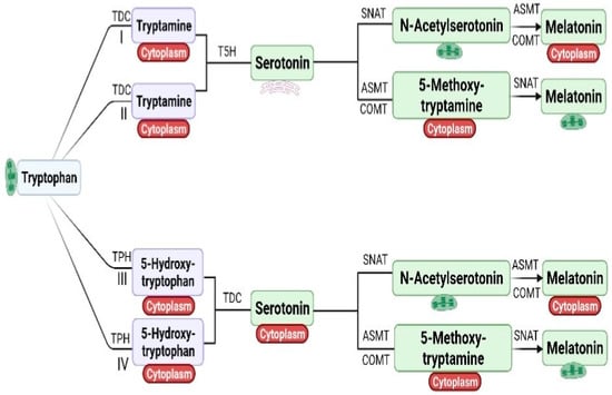 - Back, K.; Tan, D.-X.; Reiter, R.J. Melatonin biosynthesis in plants: Multiple pathways catalyze tryptophan to melatonin in the cytoplasm or chloroplasts. J. Pineal Res. 2016, 61, 426–437. [Google Scholar] [CrossRef]