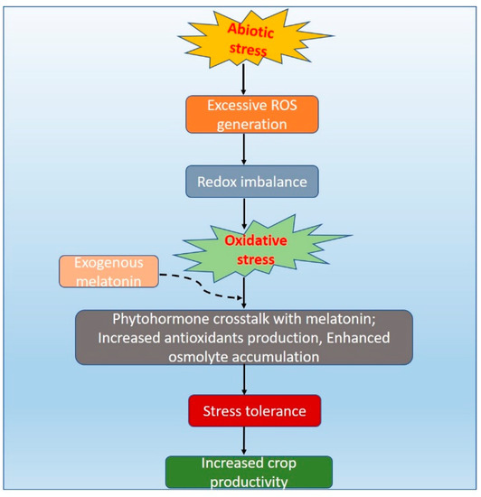 Foliar application of melatonin at 10 µM reduced heat induced photoinhibition by over expressing the N-acetyl serotonin methyltransferase (ASMT) gene. This was achieved by minimizing the electrolyte leakage through enhancing the photosystem II and high temperature tolerance in tomato seedlings by increasing the antioxidant defense system [182]. Table 1 shows abiotic stress-induced changes on exposure to melatonin in plants. Mechanisms of abiotic stress induce oxidative stress and the role of melatonin in overcoming the stress is shown in Figure 2.