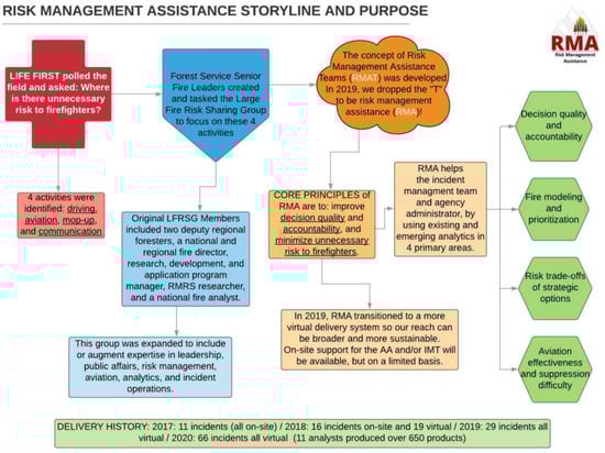 With those themes in mind, risk management assistance (RMA) was designed to assist local land and fire management decision-makers (frequently known as agency administrators (AAs) in US federal land-management agencies) and incident management teams (IMTs) in making high-quality, risk-informed decisions. RMA achieved this by providing access to experienced AAs, IMTs, and subject matter experts in risk management and fire operations, and by delivering enhanced fire analytics. The intent of the RMA program was to apply existing and emerging decision support tools, coupled with risk management expertise, to improve the overall effectiveness and efficiency of wildfire response, doing so in a manner that emphasized the co-production of knowledge and worked across traditionally siloed fire management functions. By focusing on individual, complex large wildfire events, RMA explored opportunities for and barriers to accelerating the adoption of more formal risk-informed decision-making practices in wildfire management.