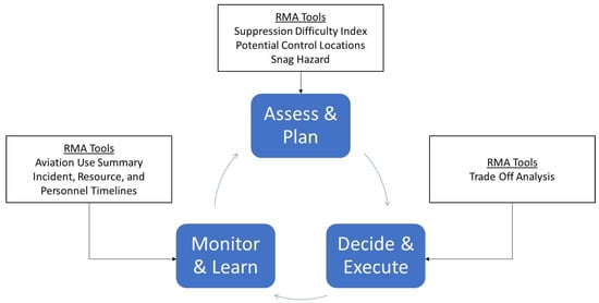 The structure and individual components of RMA fit into a standard risk management cycle that is generally consistent with other wildfire risk management processes (Figure 2; see, for example, [34,47,48]). Some RMA tools are highlighted and mapped according to the appropriate stage of the risk management cycle. “Assess and plan” involves the development of knowledge of the fire conditions, the impact to objectives, and alternative approaches to managing the event; “decide and act” require the selection of the preferred alternative and the implementation of the operational plan; “monitor and learn” determines if current actions are producing desirable results; if not, the cycle begins again.