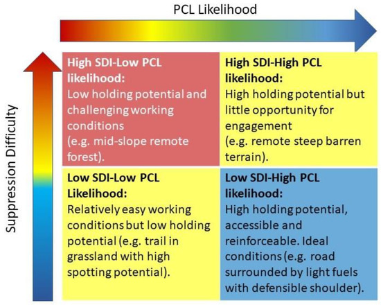SDI-PCL matrix. The color codes applied to SDI and the PCL atlas are designed to complement one another. Locations where the products agree represent the best (blue/blue) or worst (red/red) conditions for safe and effective wildfire response actions. Locations where the products diverge indicate conditions where there is a juxtaposition between suppression effort and containment likelihood.
