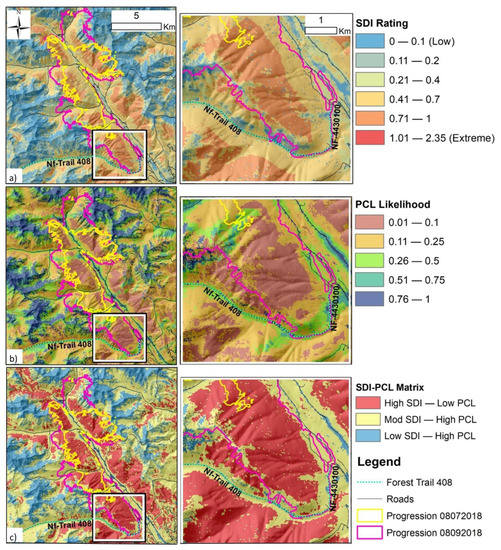 The SDI [49] is a numerical rating of the relative difficulty in performing fire control work for each map pixel. In its simplest form, SDI is the ratio of suppression hazards to suppression opportunities. The numerator is an estimate of potential fire behavior, derived from modeled flame lengths and heat per unit area, and the denominator is an estimate of suppression opportunity derived from the sum of separate indices for accessibility (vehicular), mobility (on foot), and fire-line construction rates (both mechanical and manual) [49]. Each sub-index is scaled from 1 to 10. The version used in the United States (tSDI) includes an additional adjustment penalizing inaccessible steep slopes, even in non-burnable fuel types. SDI scales are from 0 to 10 although, in practice, values greater than four are rare and fire responders consider values greater than one to be extremely difficult operating conditions. SDI has been used as a tactical response assessment tool on RMA incidents for four years, undergoing a series of adjustments and improvements based on feedback from incident management teams. Numerical breaks to classify extreme SDI conditions vary, based on regional differences in fuels, terrain, moisture, and accessibility. As an example, in wet coastal forests, fire responders considered values greater than 0.8 to be extreme, whereas in drier forests, the extreme classification is reserved for values greater than one. For fire support applications, SDI is supplied to the fire operations and planning section chief, fire analysts, and strategic planning positions in a range of digital formats to facilitate integration into the incident GIS, paper maps, and Google Earth overlays. Pre-positioned SDI scenarios can be used during the initial attack, as part of the fire sizing-up and tactical considerations for engagement. During an extended attack, updating SDI for current or forecast conditions can help with visualizing and communicating strategies and operational challenges or opportunities.