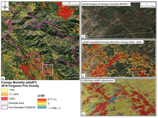 Mapped canopy mortality used to inform fire responders of snag hazard on the 2018 Ferguson Fire, Mendocino National Forest, CA. A general overview of snag hazard concerns in the vicinity of the actively growing fire (a) was informed by aerial imagery (b) and remote sensing products (c). Snag hazard was used to alter surface fuel models and spread direction assumptions in SDI calculations and demonstrated increased SDI values in most areas of high canopy mortality (d). Canopy mortality estimates leveraged the ecosystem disturbance and recovery tracker system (eDaRT) under development at the regional remote-sensing laboratory.