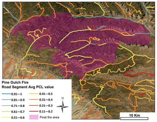 An early example of this new functionality came from the Pine Gulch Fire, ignited by lightning on 31 July 2020, north of Grand Junction, Colorado. The fire grew rapidly over the next ten days and, at a size of just under 15,800 ha (39,100 acres), RMA support was requested on 11 August. Rapid fire spread posed unique challenges for assessing the holding potential under consistent high winds and drier than average conditions. In 2020, RMA produced its first standardized regional-scale SDI and PCL products depicting 90th percentile fire weather conditions, to aid with pre-positioning data for rapid assessment and decision support. These products were supplied to the FBAN, who had used incident-specific fire weather versions of both products for previous fire support and in pre-season fire planning on his own forest. The FBAN reached out to RMA analysts to inquire about the fire weather assumptions of the new standardized SDI and PCL products and was cautioned about the “relative” nature of control likelihood under highly variable winds and fuel moistures. To address the mismatch between observed and simulated fire behavior, the LTAN ran an analysis of average PCL values for a 120-meter buffered area along a segmented network of all roads in the three counties affected by the fire. Segments were labeled according to the average PCL value for the buffered segment area, and observations of effective road holding locations were used to establish the effective PCL threshold needed for a road to serve as a functional containment location. Buffering the road corridors helped to differentiate those locations where the roads themselves were the only viable control features from those areas where a combination of road location, fuel transitions, accessibility, and fuel type and fire behavior transitions improved the potential holding capacity. The method proved successful for selecting the eventual road networks that held on the 56,250-ha (139,000-acre) Pine Gulch Fire (Figure 6) and, two months later, on the 71,580-ha (176,878-acre) Mullen Fire.