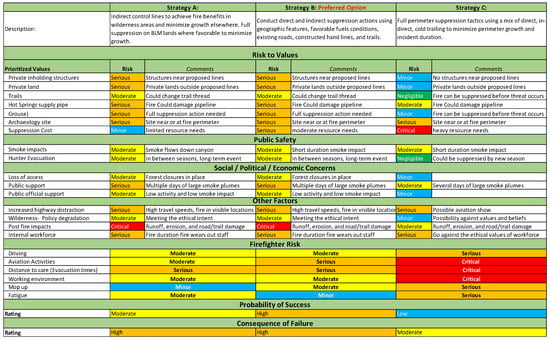 The Decker Fire started on September 8 2019 from a lightning strike in the Sangre de Cristo Wilderness, on the Rio Grande National Forest in southern Colorado. The fire ignited in rugged, remote country, with limited immediate values at risk. The AAs on the Forest, who had been exposed to RMA through previous fire engagements, requested that RMA facilitate the development of a TOA to identify strategic options for the management of the fire. The initial TOA was conducted on 9 September and was re-run on 15 September and 2 October, after the fire made significant wind-driven runs. Figure 7 provides an edited version of the Decker Fire TOA from 2 October, comparing three alternative strategies demonstrating the key components of the TOA. Specific considerations included the risk to developed and natural resource values, risk to public safety, social/political/economic concerns, risk to firefighters, the probability of strategy success, and the consequence of failure. The TOA process utilized RMA analytics, including SDI, PCL, and snag hazard to inform the initial decision on 9 September to not engage in direct suppression actions since the protection of values at risk did not justify the risk to firefighters and the estimated low probability of success, but it did support indirect suppression to modify fire spread on some portions of the fire. As the fire progressed, and the risk of negative fire impacts increased, the TOA supported additional indirect fire actions while still recognizing the value of avoiding direct actions on the fire line. The fire burned a total of 3626 ha, with fire progression stopped on October 24 due to a major snow event. Following the conclusion of the fire, Schultz et al. [60] conducted an independent review of the management of the Decker Fire by interviewing key participants, to better understand their perceptions of the TOA process. Respondents emphasized the value of the TOA in structuring conversations regarding objectives across ownerships and achieving agreement, thoughtful consideration of the risk to firefighters, and providing documentation of the decision process.