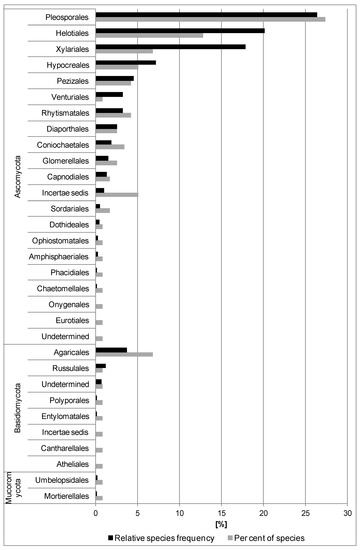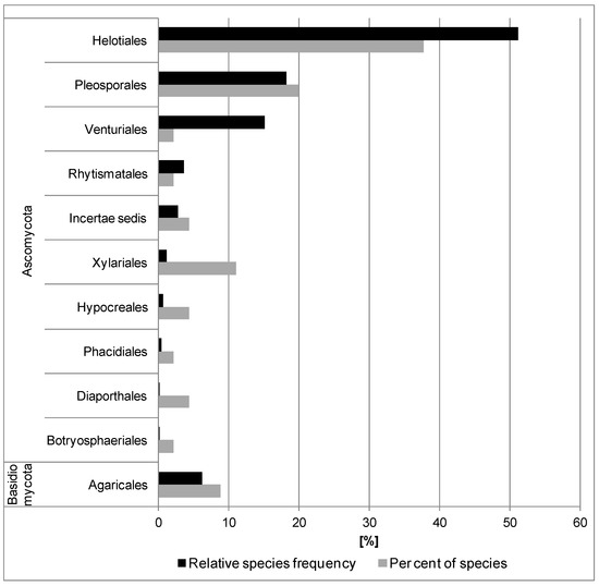 Frequency of fungi detected in situ from fruit bodies on the previous year’s leaf petioles of F. excelsior. Relative species frequency calculated as the ratio of the number of specimens in the order to all specimens n = 882. Percent of species calculated as the ratio of the number of species in the order to all species n = 45.