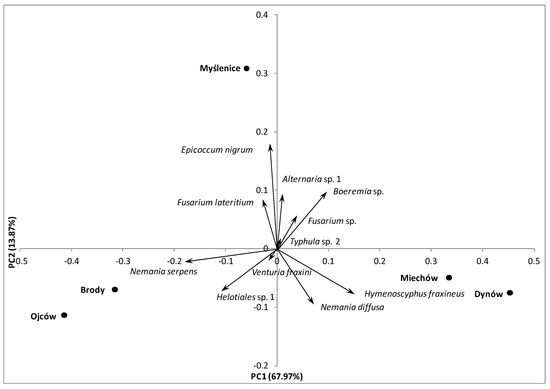 Principal component analysis (PCA) separated the localities along the first axis (explaining 67.97% of the variation), mainly on the basis of prevalence of Nemania serpens, H. fraxineus, Helotiales sp. 1 and other dominant species (Figure 2). The second PCA axis explained 13.87% of the variation and separated Myślenice from other locations. This axis separated locations mainly on the basis of prevalence of Epicoccum nigrum and the other dominant species, e.g., Alternaria sp. 1, Boeremia sp. and Nemania diffusa (Figure 2). The difference in the prevalence of E. nigrum at Myślenice and at Ojców and Dynów was statistically supported by the Marascuilo procedure. Similarly, N. serpens was significantly more frequent at Ojców than at the other locations, whereas H. fraxineus was significantly more frequent at Dynów and Miechów than at other locations (Table 2).