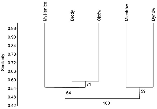 The Shannon diversity index (H′) and Simpson’s diversity index (SDI), indicating the diversity over all five stands, were H′ = 2.73 and SDI = 0.89. There was most diversity at Ojców (H′ = 2.82, SDI = 0.91) and least at Miechów (H′ = 1.99, SDI = 0.79) (Table 3).