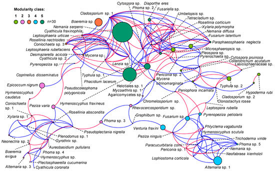 Network of co-occurrence of fungi isolated from the previous year’s leaf petioles of F. excelsior in five stands, in southern Poland, determined on the basis of data grouped for the study plots. Each connection shows a strong (Spearman’s p > 0.6) and significant (p < 0.05) correlation. Blue lines indicate positive and red lines negative correlation. Five modules were generated, and the same color represents fungal taxa with potential co-occurrence in the same module. The frequency of the species was indicated by the size of each node.