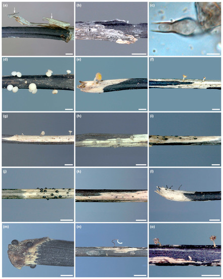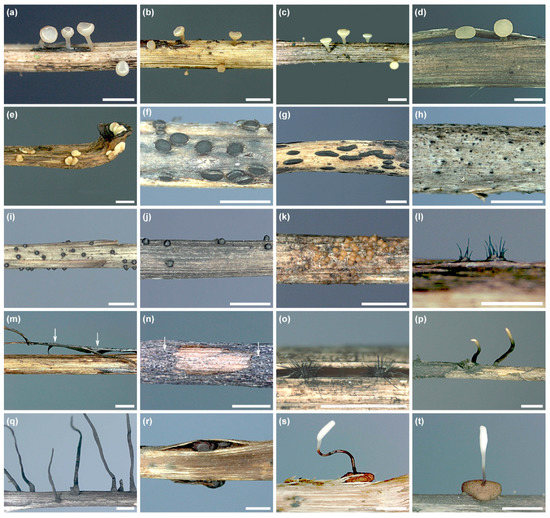 The high level of taxonomic diversity was demonstrated by the diversity of fruit bodies on the dead petioles (Figure 6a–t). Colonization of petioles by certain fungi was associated with discoloration of the surface of the colonized petiole pieces, e.g., Hymenoscyphus scutula, Helotiales sp. 1, Hypoderma rubi and L. sclerotioides caused, respectively, grey-brown, rusty-brown, light-cream or dark-grey discoloration (Figure 6d,e,g,j).